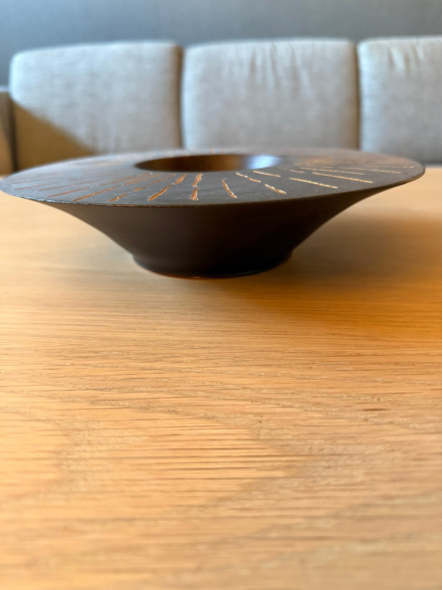 Hånddreid fat i tre – Burnt Umber med gullmønster (24 cm)