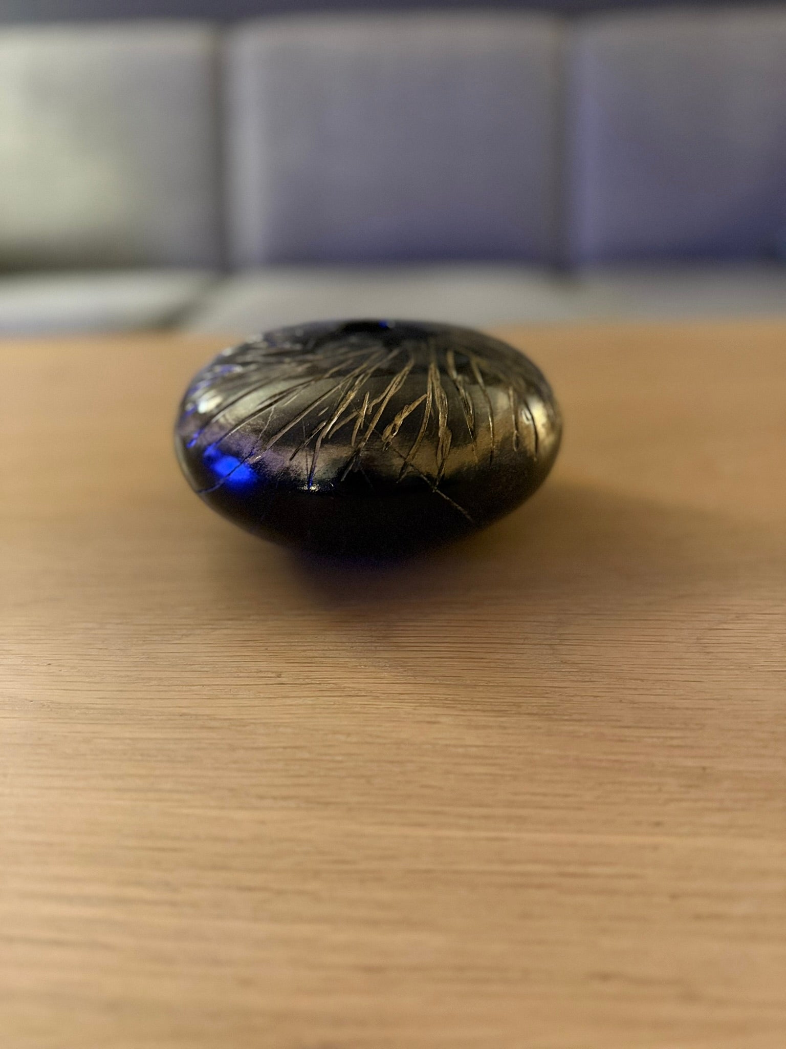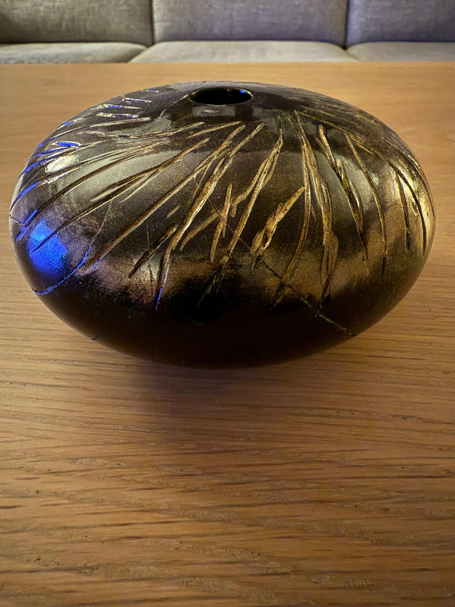 Dreid pyntevase i sort – håndlaget og dekorert med gullmønster