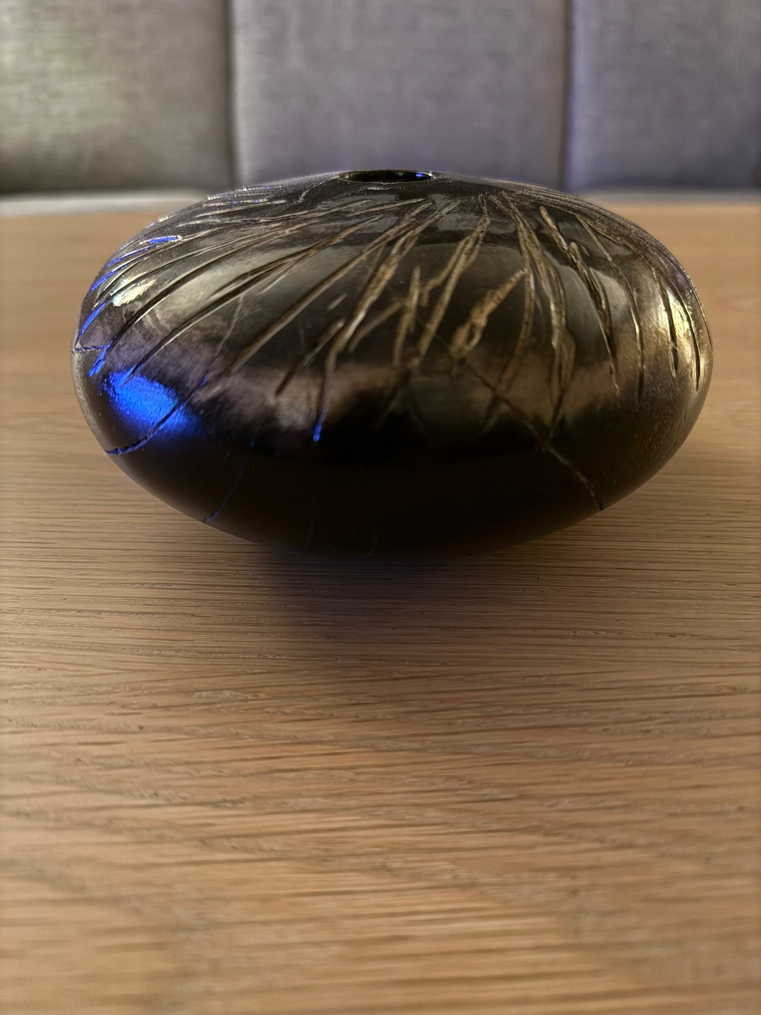 Vasen er dreid for hånd i tre, malt sort og deretter lakket i flere lag for å få den dype, rene glansen. Øverst har den en tynn og elegant åpning, akkurat stor nok til ett strå, en liten blomst – eller rett og slett ingenting. Noen ting gjør seg best helt for seg selv. Ca 18 cm diameter og ca 11 cm høy