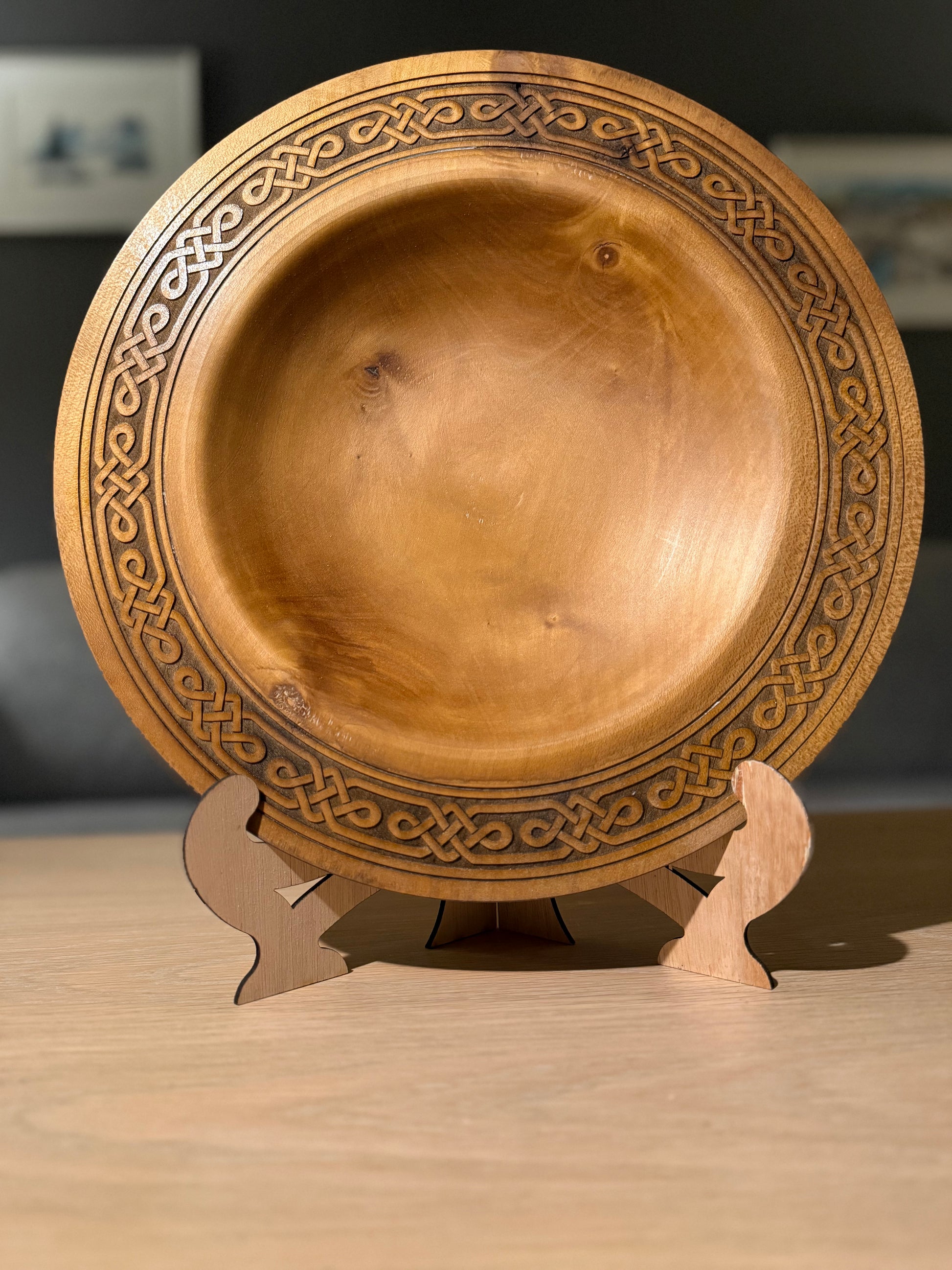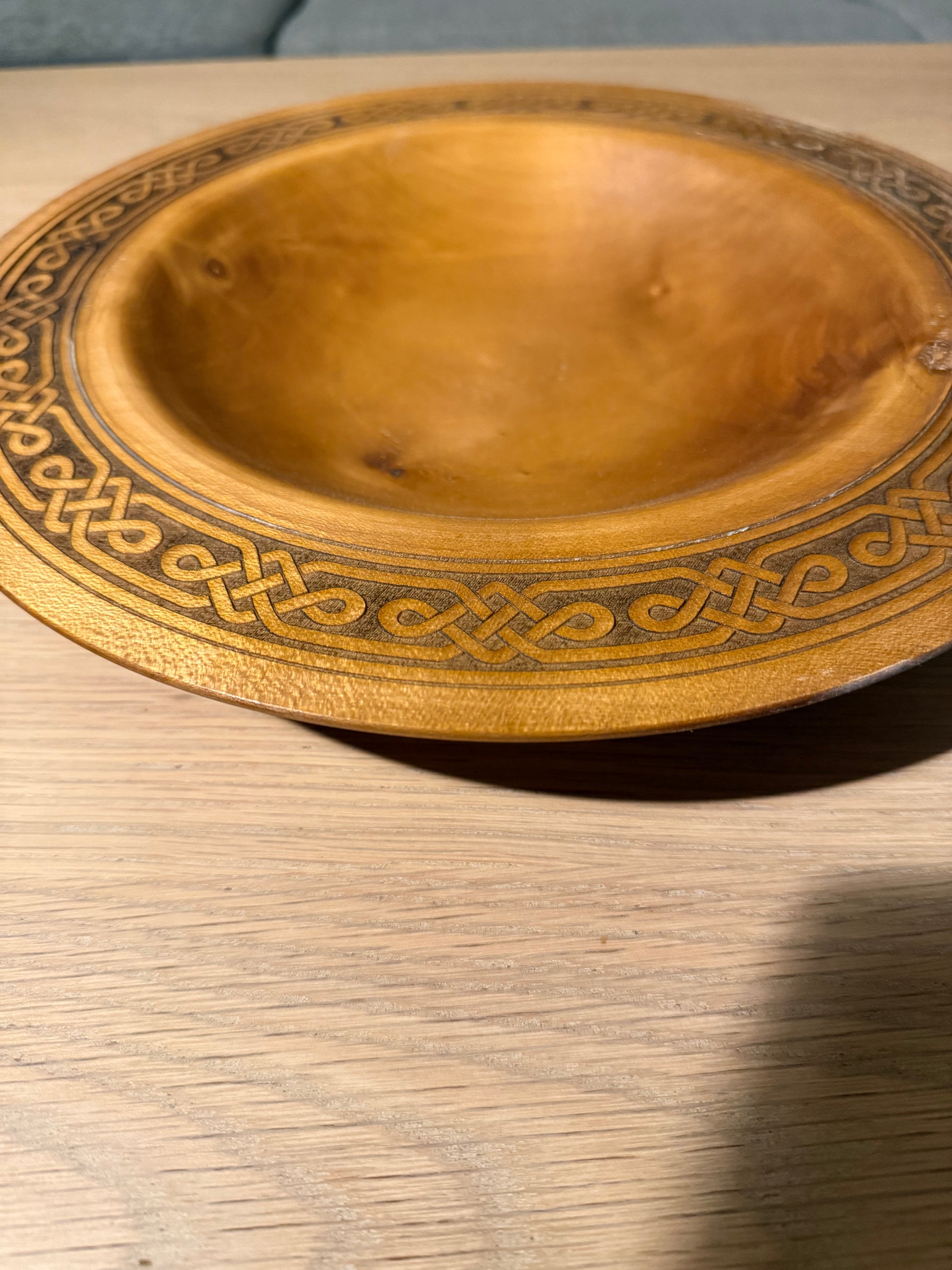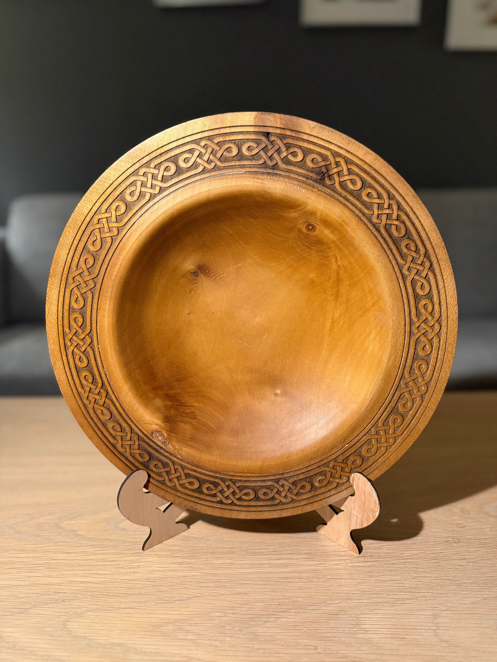 Dette store dreide fatet er laget for deg som setter pris på godt håndverk og naturlig varme i hjemmet. Fatet er dreid for hånd i vakkert treverk, beiset i en lun teakfarge og avsluttet med en nøye gravert kant i keltisk inspirert mønster. Resultatet er et tidløst og harmonisk uttrykk som passer like godt på stuebordet som som midtpunkt på spisebordet.