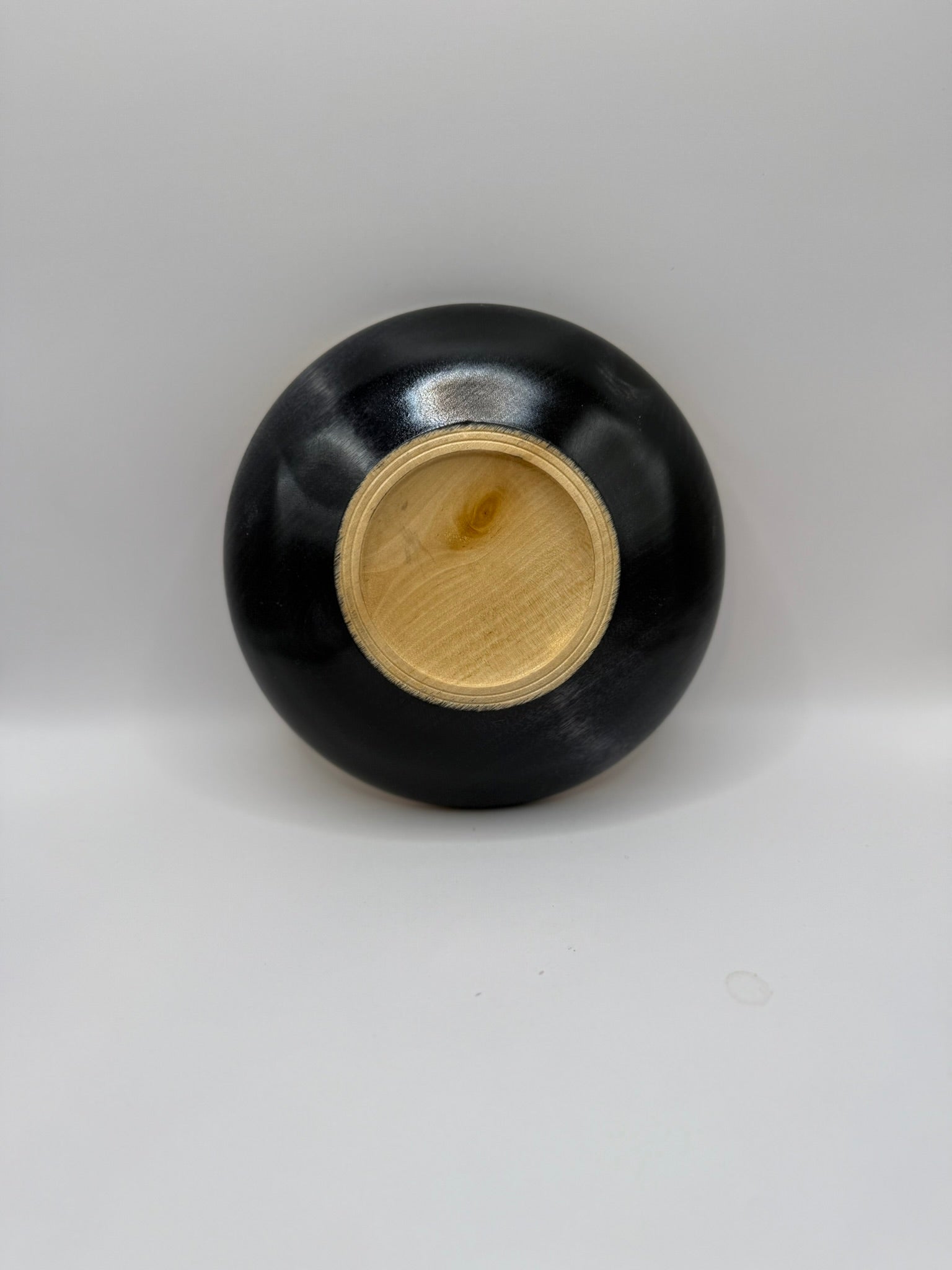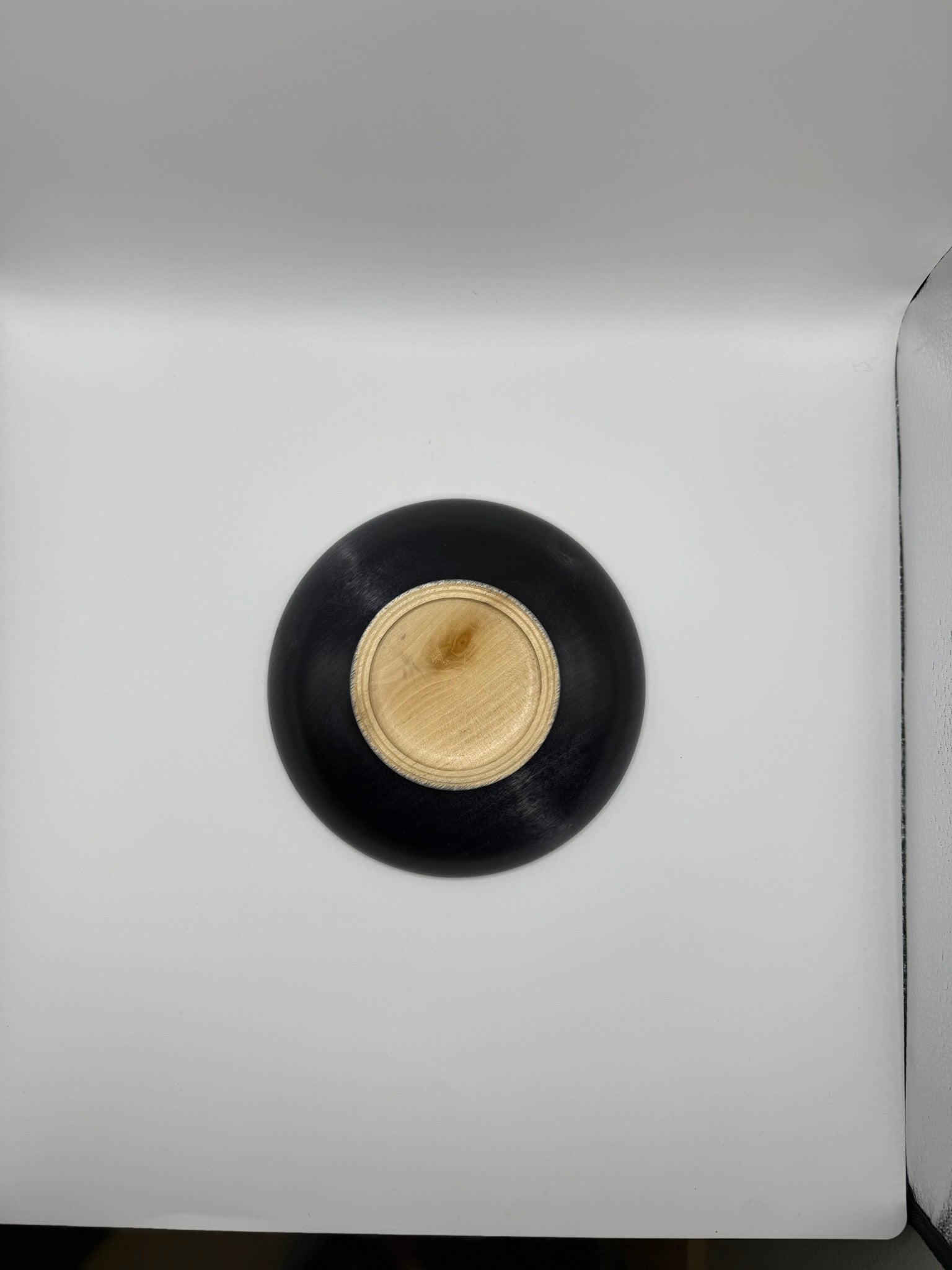 En liten dreid skål i tre, beiset i royal blue og sort på utsiden, mens innsiden er holdt naturlig trehvit og behandlet med matvennlig voks. Den er 16 cm i diameter og 3,5 cm høy – akkurat passe til en håndfull peanøtter, smågodt eller annet småsnacks.