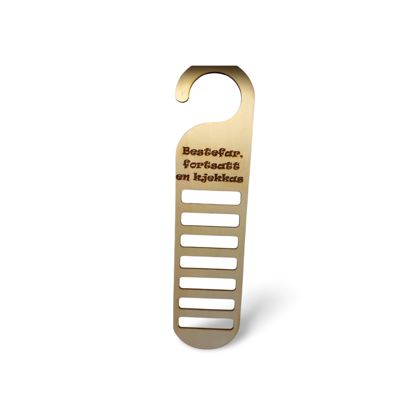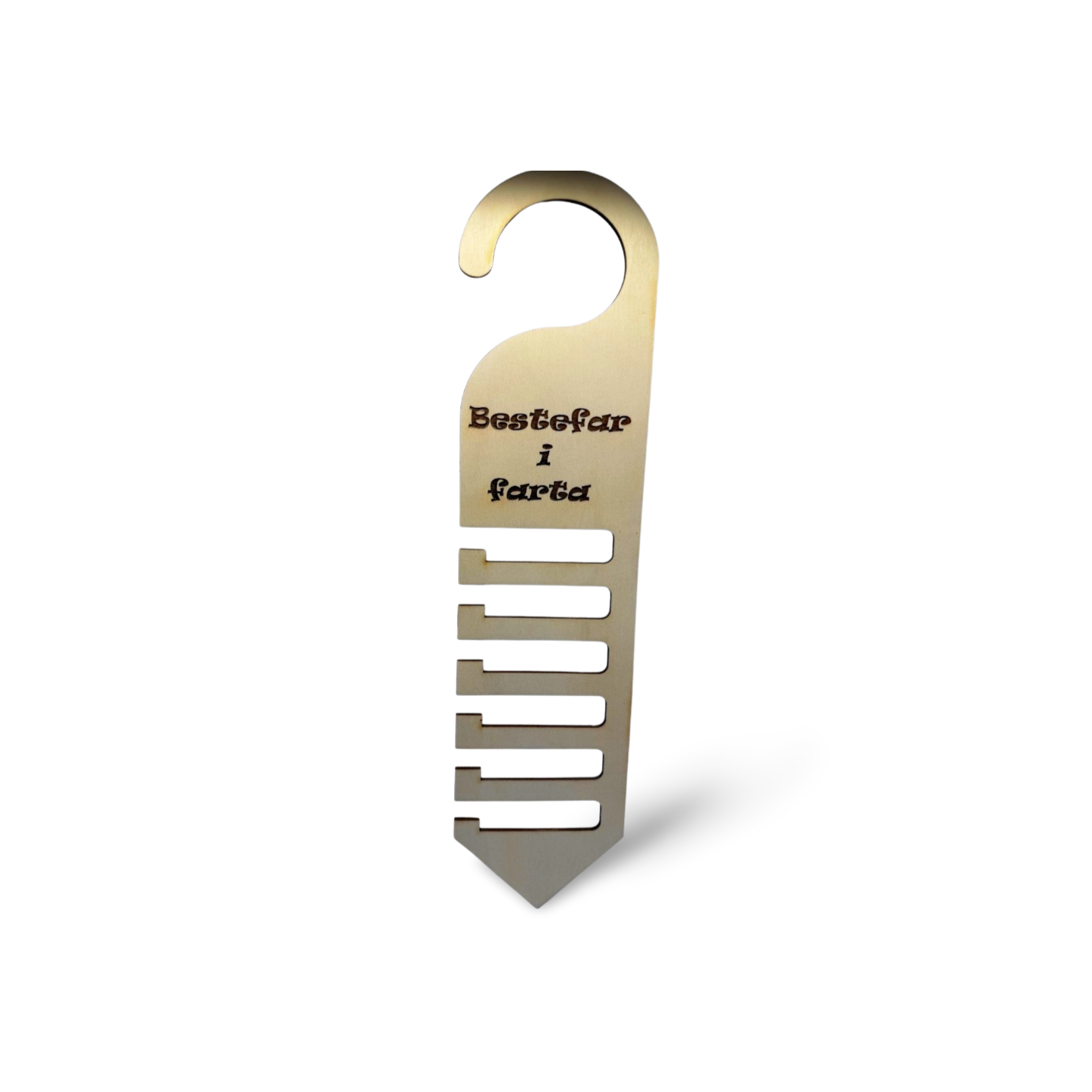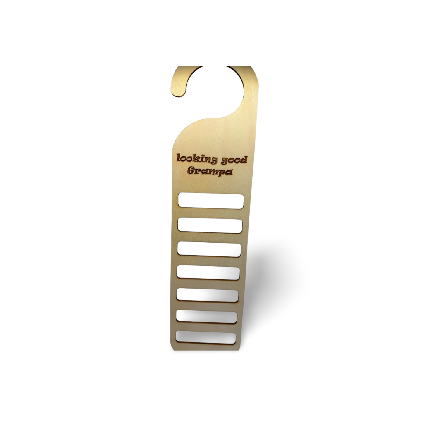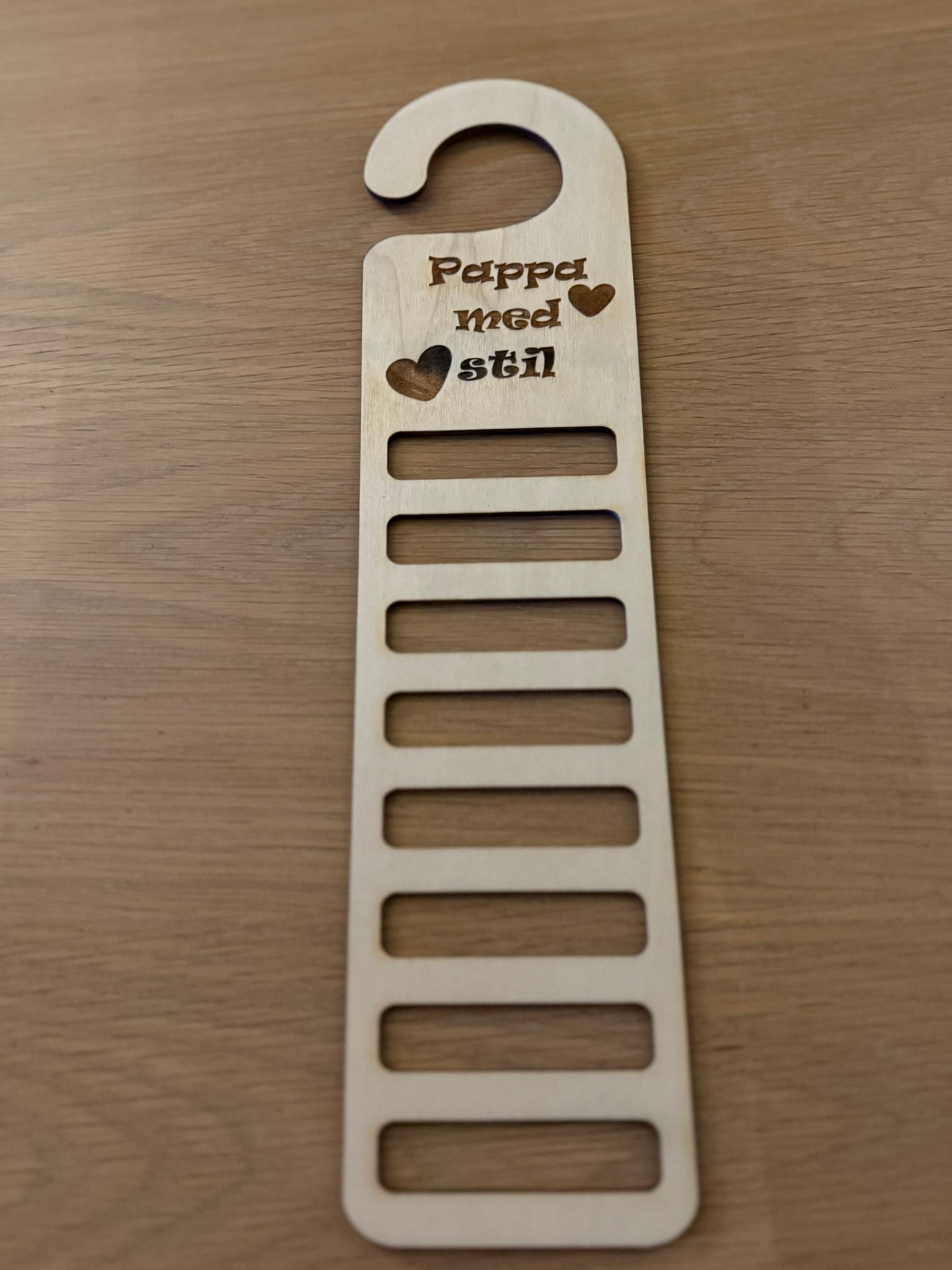 Her snakker vi både orden og sjarm i samme pakke! Denne slipsholderen er laget i solid kryssfiner, skåret med laser og pusset for hånd, klar til å henges rett på garderobestanga.